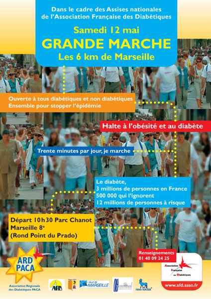 LAssociation Française des Diabétiques (AFD) et lAssociation Régionale des Diabétiques PACA organisent une Grande marche de 6 Kms, le samedi 12 mai prochain à Marseille (départ 10h30 du Parc Chanot), dans le cadre des assises nationales de lAFD dans la cité phocéenne. Ouverte à tous et pas seulement aux diabétiques, cette chaîne de solidarité a comme objectif damener » pas à pas » à une meilleure prise de conscience collective de la gravité de cette maladie et à l’importance de la prévention pour lutter contre la progression du diabète de type 2.