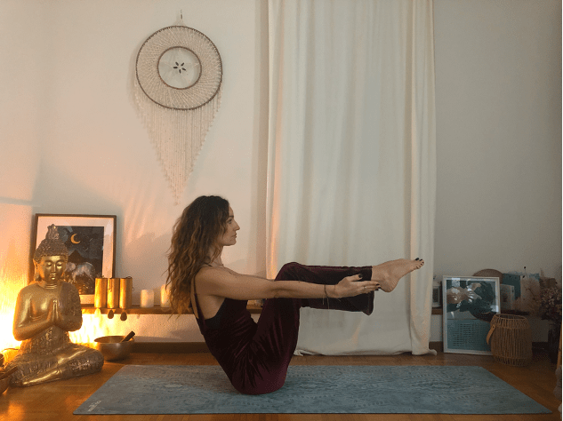 Bienfaits : Renforce les muscles abdominaux ainsi que le bas du dos. Stimule les centres énergétiques du ventre et du bas-ventre. Prévient les ballonnements et stimule la circulation. Renforce les muscles fléchisseurs des hanches et permet de travailler son équilibre et son alignement. Détend et donne de l’énergie au corps.