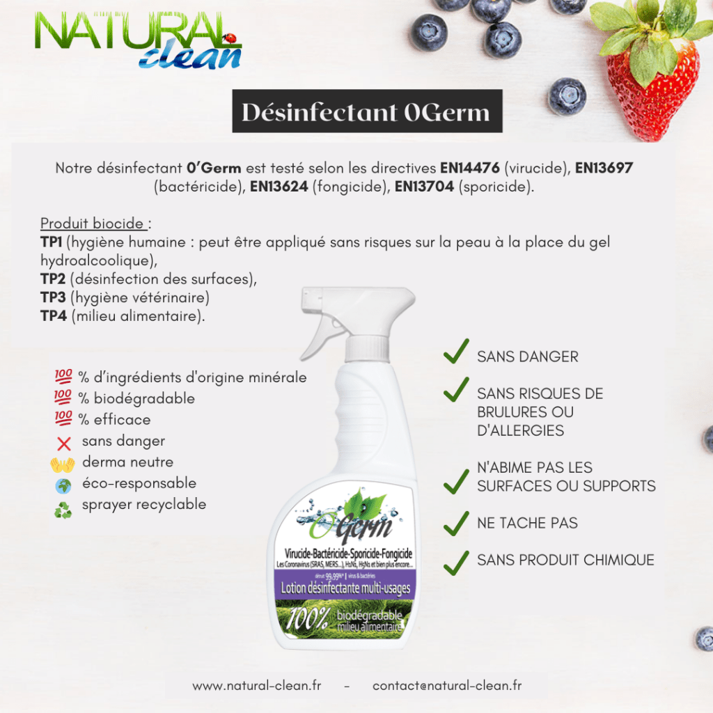 Dans ce contexte, nous avons fait la connaissance de Natural Clean, une toute jeune entreprise française qui commercialise une gamme de produits ménagers 100% minéral pour le particulier et l’industriel : Clean100 (marque allemande). Nous avons testé son produit phare : le désinfectant O’Germ 100 % minéral qui concilie efficacité et respect environnemental. Nous l’avons testé sur différentes surfaces, notamment les poignées de portes, les bureaux, les chaises… Le résultat est très satisfaisant, il ne se rince pas, peut être utilisé sur les surfaces alimentaires, ne laisse pas de pellicule grasse, il est sans parfum et surtout sans danger pour la santé et la planète !