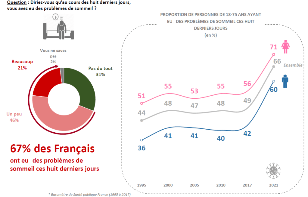 - 67% des Français déclarent avoir eu des troubles du sommeil au cours des 8 jours précédant l’étude.