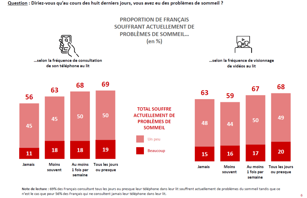 - 69% des personnes consultant leur téléphone au lit tous les jours ou presque souffrent actuellement de problèmes de sommeil contre 56% de ceux qui ne le consultent jamais.