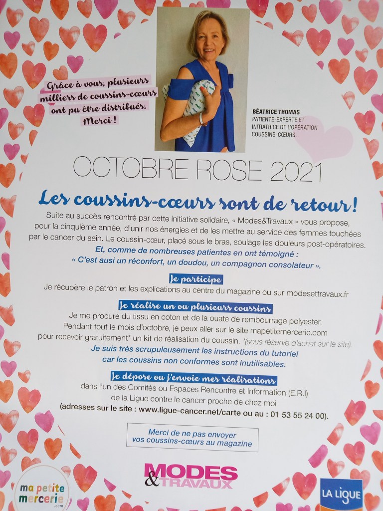 Ce prototype a été mis en place par un médecin américain. Pour la 5e année consécutive, l’initiative portée par Béatrice Thomas, patiente-experte et le magazine Modes & Travaux assure la promotion de la réalisation de ces coussins-coeurs (attention patron et matériaux spécifiques). Ceux-ci doivent être en coton et en ouate de rembourrage polyester (kit de réalisation du coussin sur mapetitemercerie.com ).