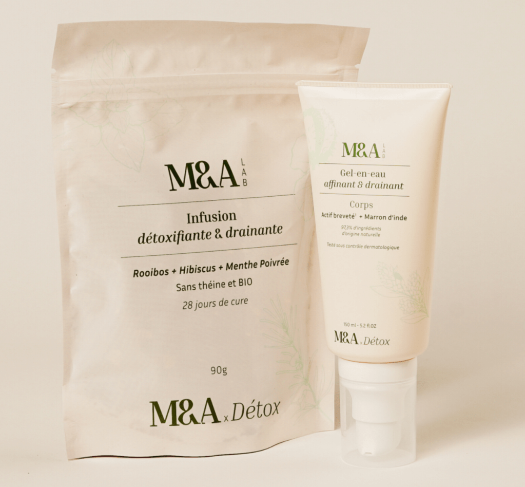 Objectif de cette routine In@Out M&A Détox ? : « Notre organisme est soumis à notre hygiène de vie et accumule de nombreuses toxines. Afin de faciliter leur élimination, notre routine In&Out M&A Détox, contribue à éliminer les déchets de notre corps grâce à l’association plantes diurétiques et dépuratives. De plus, la rétention est un phénomène commun avec différentes conséquences sur notre bien-être. Elle peut ainsi, impacter notre confort, en particulier nos jambes. Qui n’a jamais ressenti une sensation de jambes lourdes, de maux dans les mollets ? Notre Gel-en-eau soulage immédiatement la sensation de jambes lourdes grâce au Menthol et au Gingembre et améliore durablement l’aspect des jambes grâce au Marron d’Inde et à notre actif breveté !«